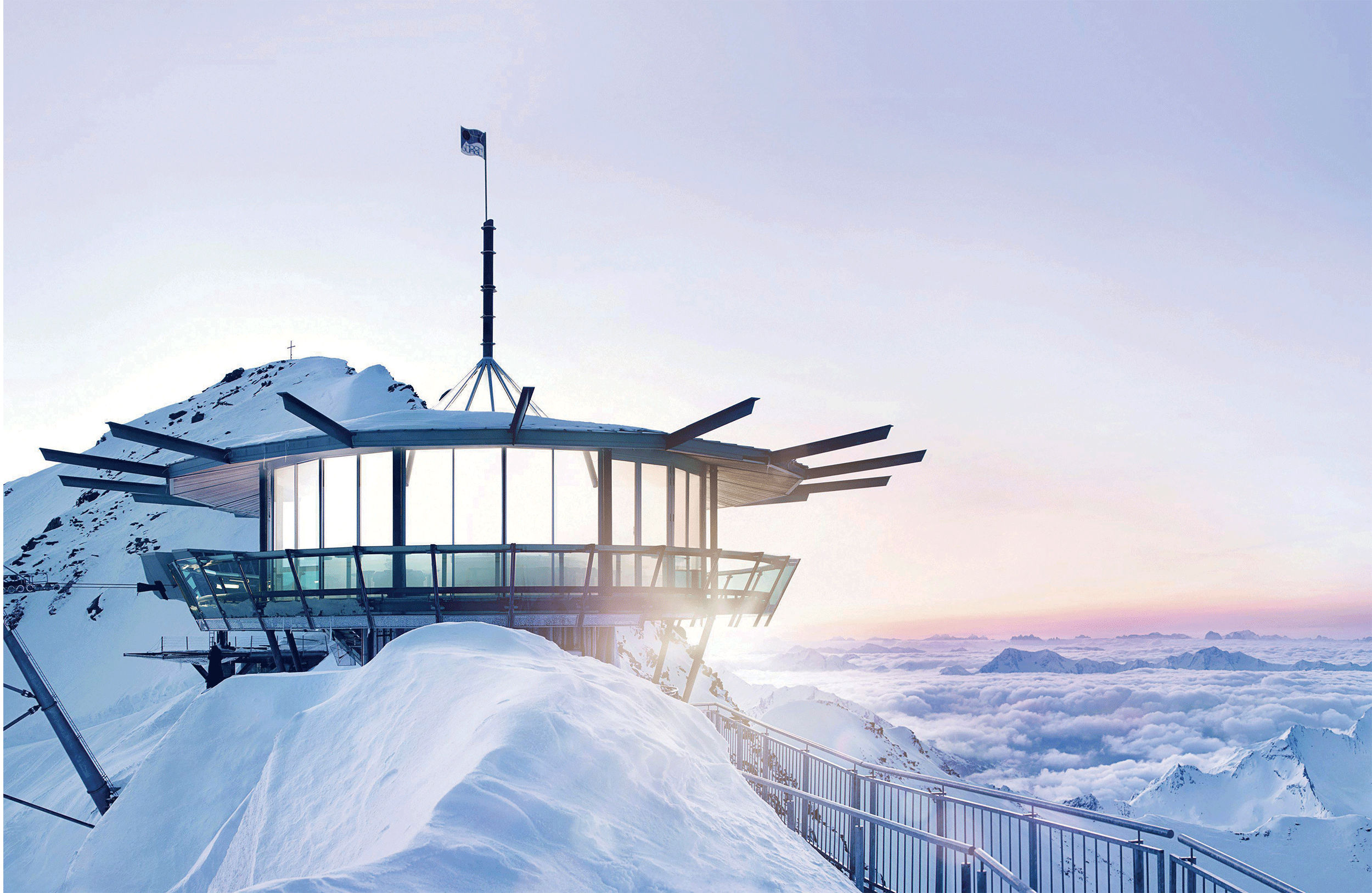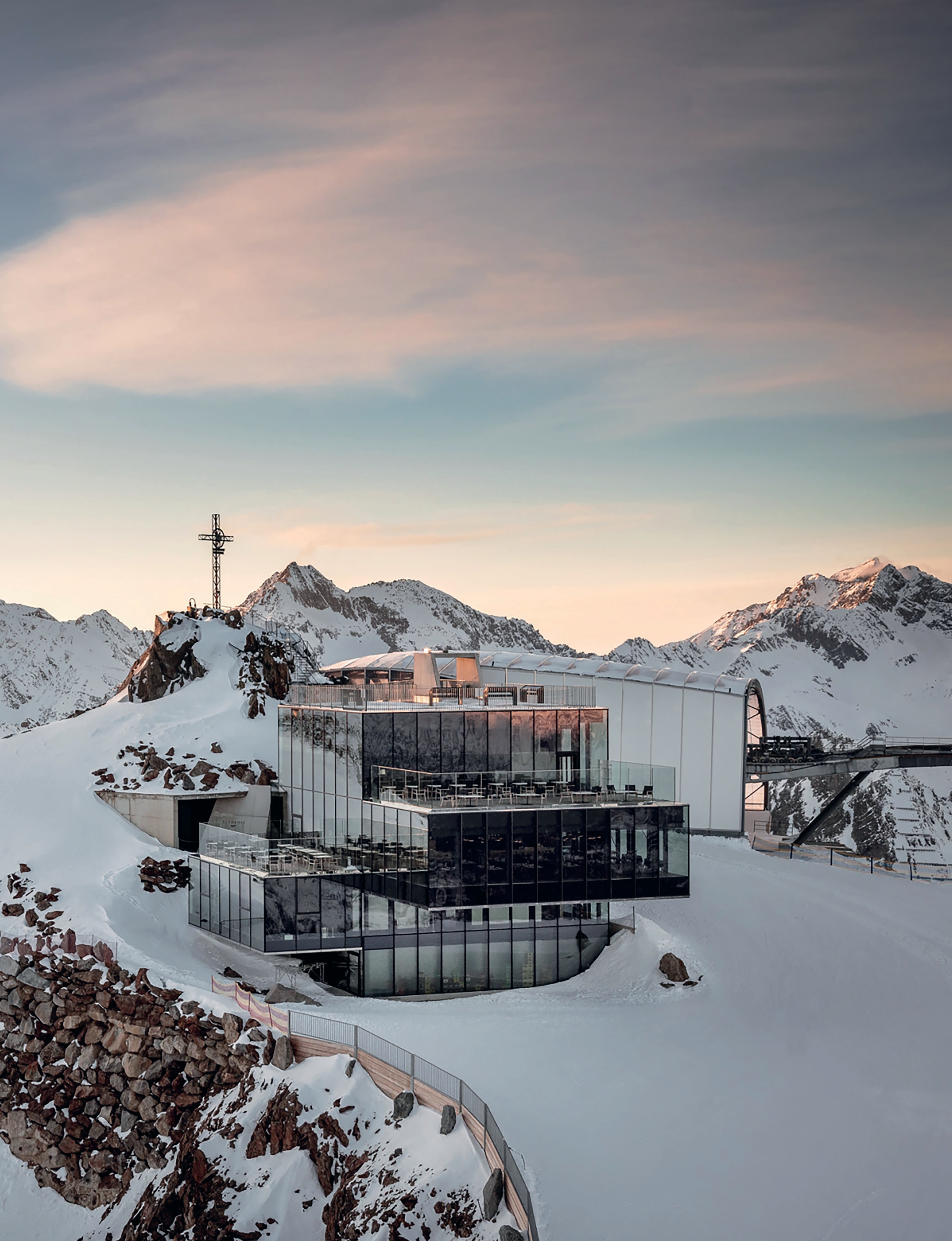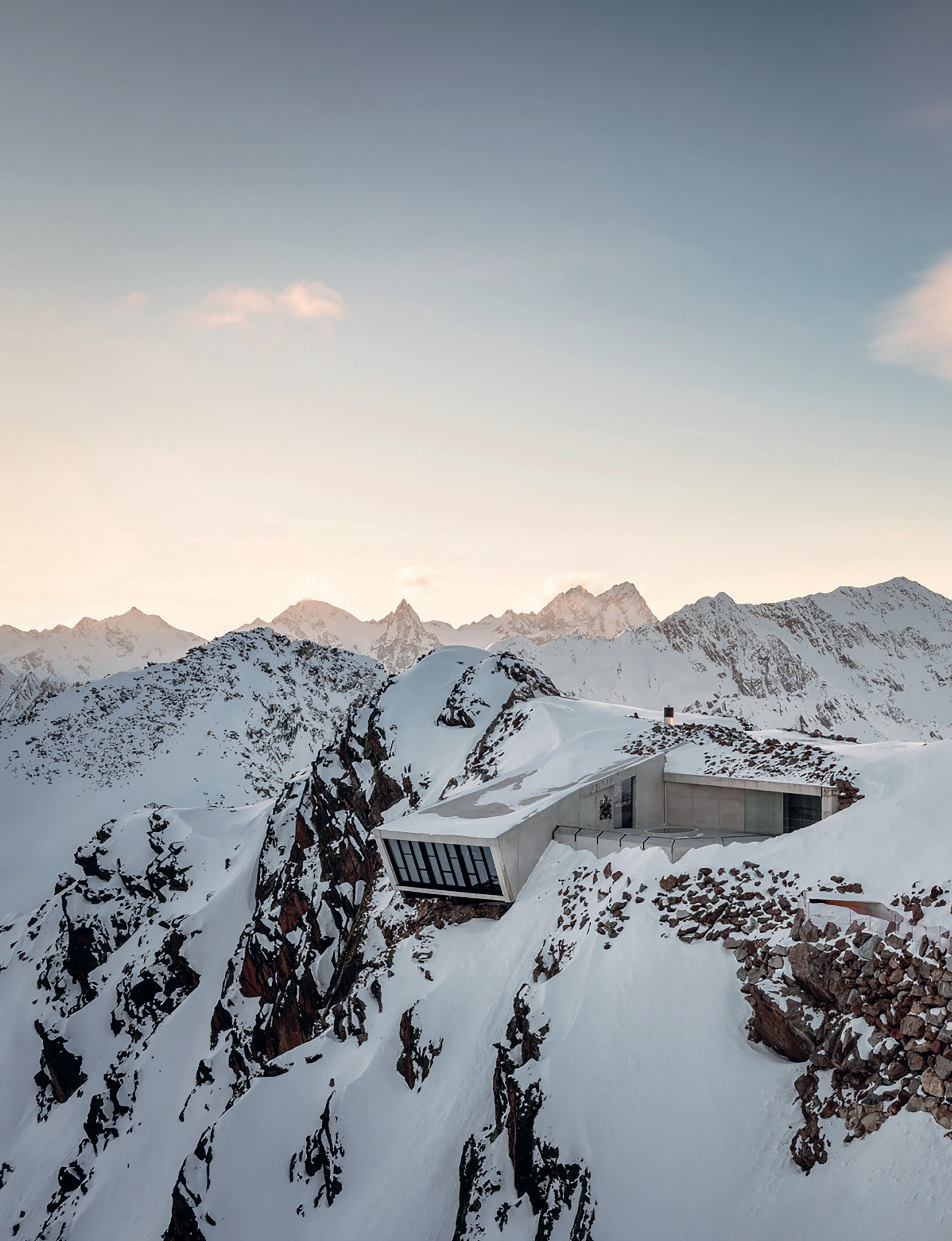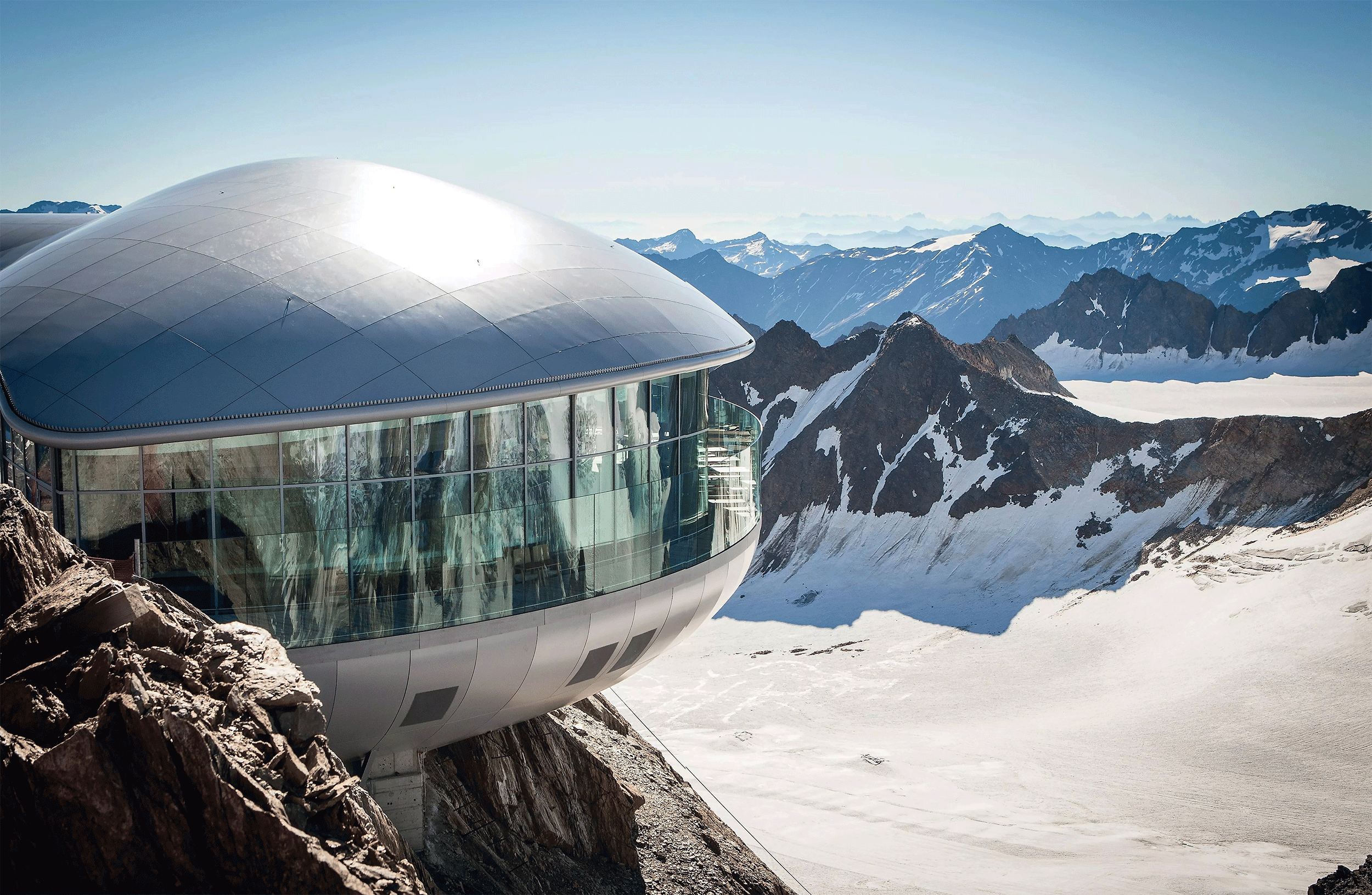 À plus de 3 030 m d'altitude, cet OVNI architectural est perché sur une étroite crête du Wurmkogel. Ce restaurant d'altitude allie avec brio une plateforme panoramique et un bar au sommet qui permet de profiter d'une vue imprenable sur les Alpes de l'Ötztal jusqu'aux Dolomites. © Hasselblad