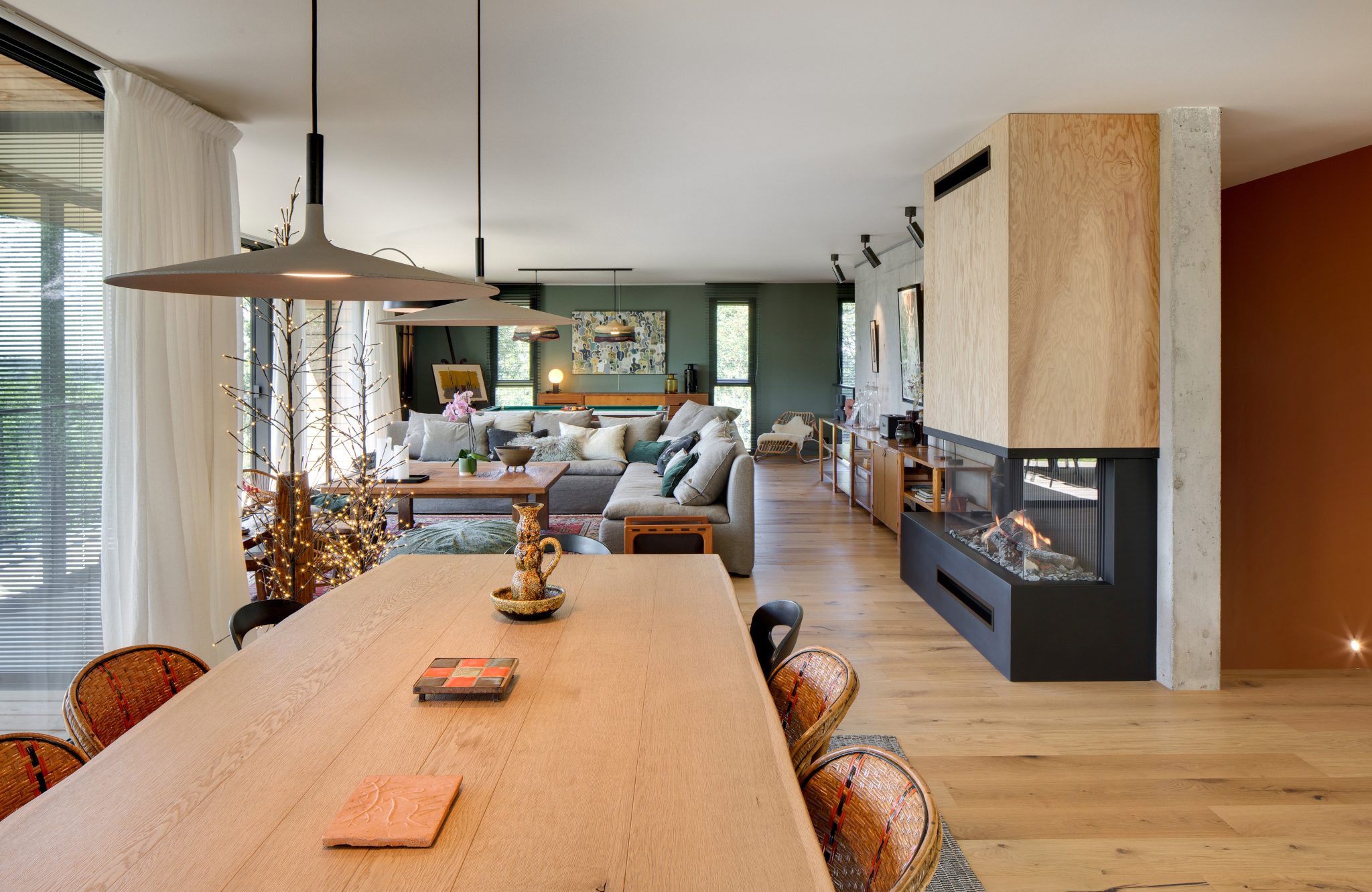 La pièce maitresse de l’Avancée est une terrasse couverte de 50 m2, juste au-dessus des arbres afin de dégager la vue sur le massif du Sancy, point culminant de la région. La grosse cheminée à bois sert de braséro et chauffe l’espace salon. Nous sommes à 900 m d’altitude, autant dire que les soirées restent fraiches, hiver comme été. Cette terrasse couverte offre une pièce supplémentaire et une continuité visuelle dedans/dehors à travers ses baies vitrées coulissantes. Une expérience réjouissante. Et cerise sur le gâteau, il existe une seconde terrasse en plein air. Multiplier les terrasses, c’est multiplier les vues avec une sensation différente à chaque fois : prendre son petit déjeuner, profiter des derniers rayons de soleil, admirer les étoiles filantes dans ce ciel particulièrement pur. Ces espaces demeurent le meilleur endroit pour observer, sentir et ressentir la nature qui entoure cette bâtisse tout en longueur.