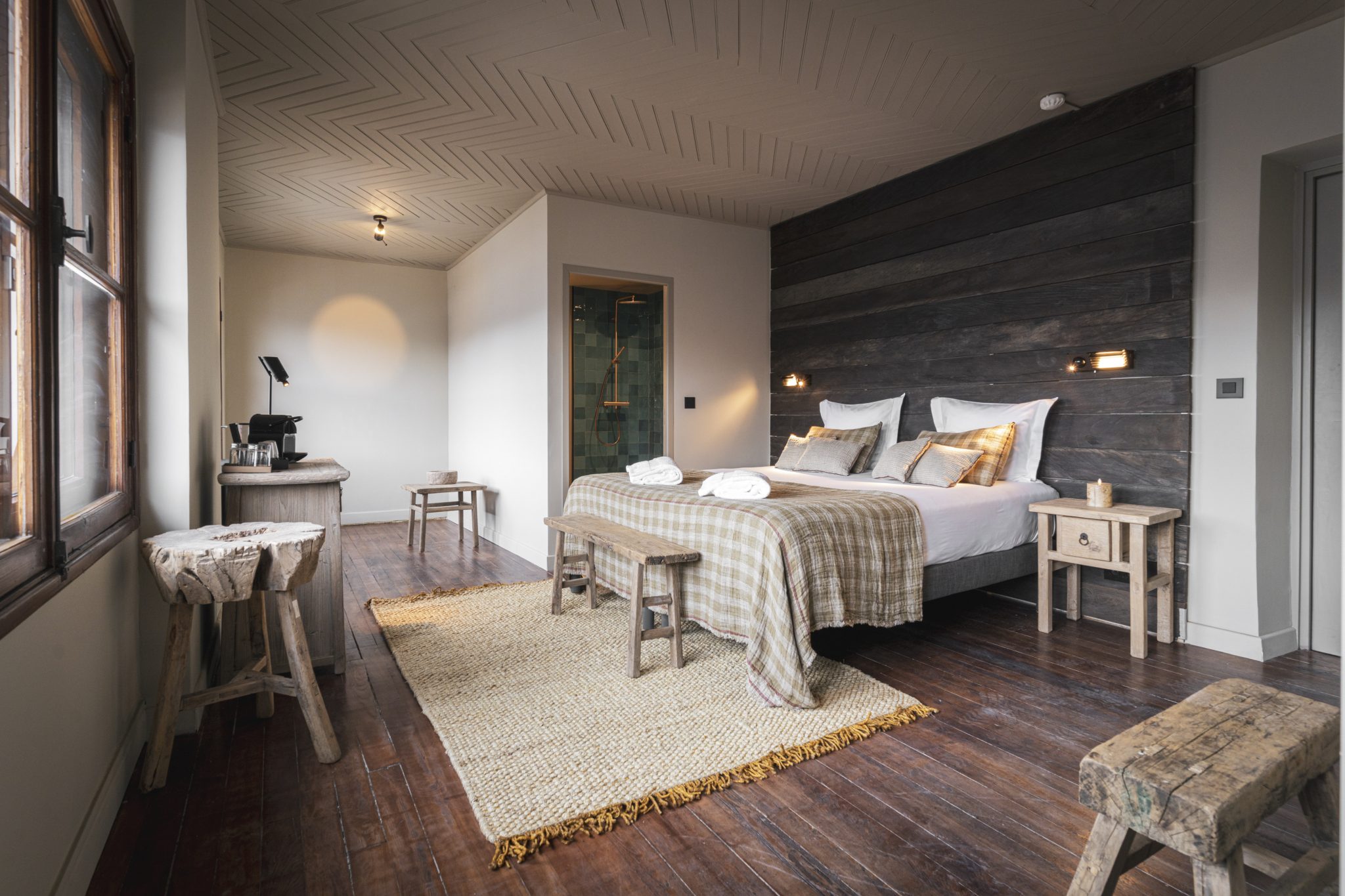 « Il existe une attente des clients dans ce lieu, avec un peu de kitsch d’où l’idée de conserver ces chaises en bois très traditionnelles, simplement reponcées. Si on va trop loin, c’est trop élitiste. Quand je suis entré dans ce lieu pour la première fois, la structure bois et les planchers, tout ce qui était noble était pollué par les précédentes organisations intérieures, avec des tapis, des bois peints. J’ai retravaillé sur la structure et mis une touche contemporaine, à travers des objets très pointus comme DCW Editions pour les luminaires, du mobilier ancien patiné d’Atmosphère d’Ailleurs », poursuit Olivier Frémont. L’architecte d’intérieur a privilégié des objets et des meubles à fort potentiel émotionnel qui brillent par leur simplicité et leur force évocatrice ; le secret de la beauté intemporelle. Des planches en bois noir sont récupérées et installées en têtes de lit offrant un repère fort dans les chambres.
