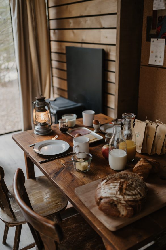 Trente-sept cabanes en bois, dont la plus grande fait 35 m2, composent le village de Nutchel (nom simplifié du mot anglais nutshell qui signifie petite coquille de noix). Chacune est venue se glisser entre les arbres comme la main dans un gant. Si certaines possèdent des bains nordiques donnant la sensation de se baigner dans la forêt, d’autres possèdent des toits-terrasses à 4,5 m de haut afin de profiter de la vue. Les cabanes sont préfabriquées en usine à partir de panneaux massifs lamellés-croisés (CLT) ; un assemblage de plusieurs couches de bois de résineux résistants au climat rude, avec un faible impact écologique. Les installer fut (presque) un jeu d’enfant. L’architecte d’intérieur Charlotte Besson-Oberlin (Atelier dix9mai) a imaginé les intérieurs des cabanes, en collaboration avec Clémence Rousseau-Dumarcet, dans un esprit wabi-sabi, c’est-à-dire en acceptant la beauté imparfaite, selon l’expression japonaise. Le mobilier provient de bois de récupération recyclé et retravaillé par leur menuisier. Le reste a été chiné dans des brocantes.