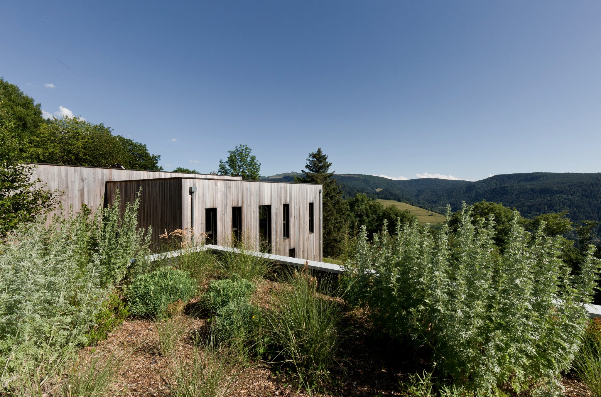 Construire en pleine nature est une opportunité rare. Alors pas question de faire n’importe quoi. Il existe des éléments fondamentaux à garder en tête pour rendre le projet le plus respectueux de l’environnement que possible. « Préserver le maximum de végétation lors du terrassement a été ma priorité ! J’ai ainsi réussi à sauvegarder le magnifique sapin devant la maison. L’idée est d’offrir un lieu adapté à la nature environnante et qui invite à découvrir cette région différemment », poursuit Nadine Auriacombe. Bien orientée afin de capter le maximum de rayons de soleil en hiver, la maison possède une toiture plate végétalisée. Elle se fond dans le paysage comme pour mieux se faire oublier.