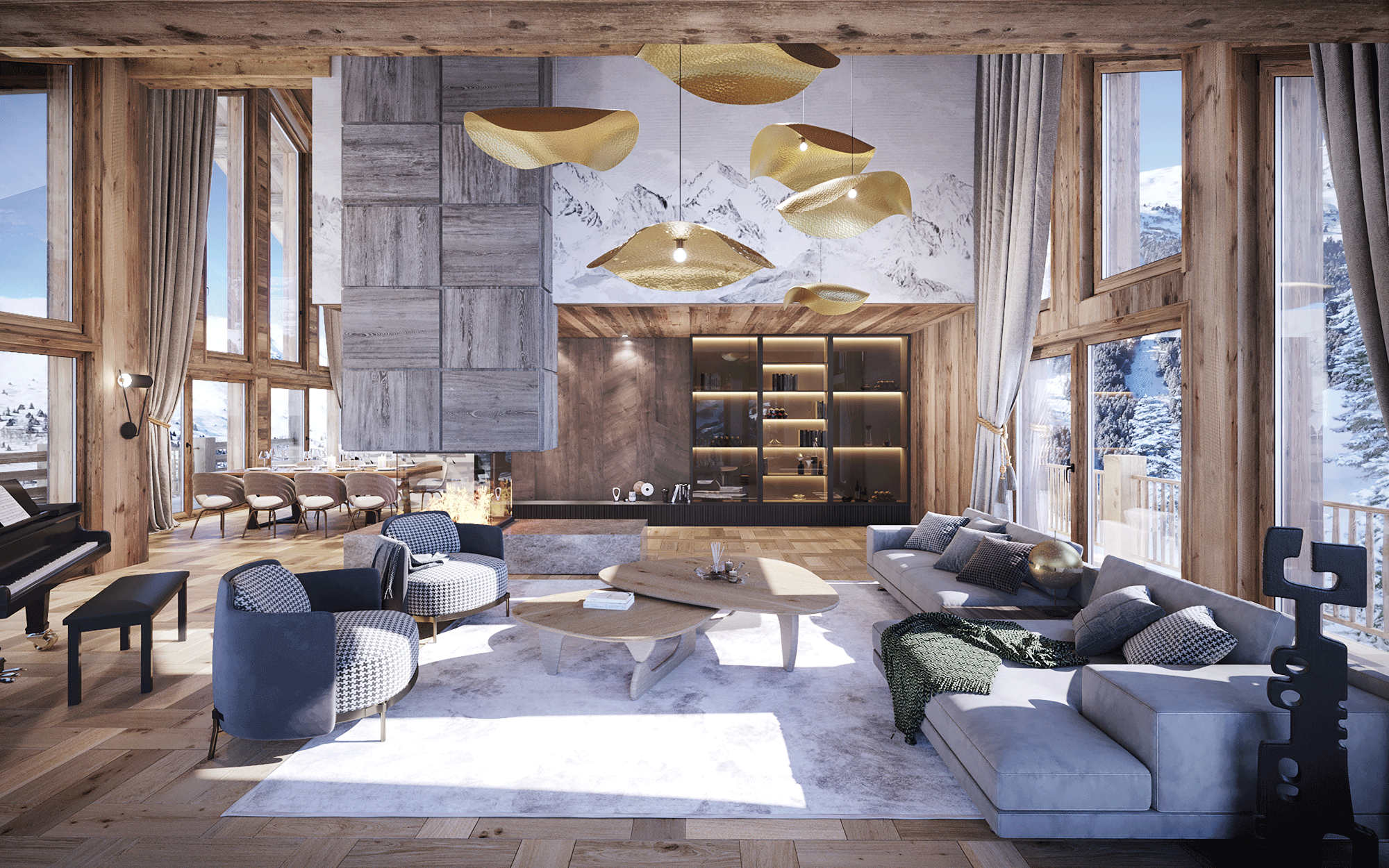 À l’intérieur, même exigence. L’agence JMV Resort signe une décoration soignée, pensée comme le prolongement naturel de l’architecture. Les sols des pièces à vivre sont habillés d’un parquet contrecollé artisanal, sélectionné pour sa stabilité en altitude et son rendu chaleureux. Dans les chambres, la moquette haut de gamme apporte confort acoustique et isolation thermique. Les murs se parent de textiles tendus, dans des teintes douces, tandis que les pièces d’eau sont revêtues de faïences italiennes aux finitions mates ou satinées. Le bois clair, vieilli avec subtilité, est omniprésent : placards sur mesure, habillages muraux, éléments de menuiserie. La pierre naturelle, locale, ponctue certains espaces — encadrements, manteaux de cheminée, niches décoratives — apportant texture et densité. L’ensemble compose des atmosphères à la fois élégantes, personnalisables et durables, dans un dialogue permanent avec la lumière et le paysage.
