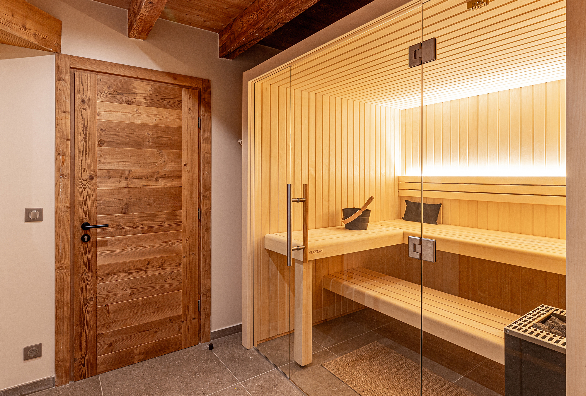 Les menuiseries en bois étuvé fumé, avec leurs lignes modernes et leur savoir-faire artisanal, renforcent l'union entre tradition et modernisme. Les murs, habillés de papiers peints aux motifs évoquant les paysages alpins, ancrent le chalet dans son environnement naturel tout en apportant une touche graphique et actuelle. Les salles de bains, revêtues de feuilles de pierre, ajoutent une touche de luxe tout en renforçant l'authenticité du lieu. Le Chalet Célestin se distingue par sa capacité à mêler habilement des influences classiques et contemporaines. À l'étage supérieur, des matériaux bruts et élégants – tels que la pierre de Luzerne et un parquet en chêne brut – créent une atmosphère à la fois chaleureuse et résolument moderne. Le bleu Klein, lui, ajoute une touche de dynamisme, en réveillant cette palette naturelle par un contraste subtilement vibrant. Au rez-de-chaussée, l'ambiance devient plus intime et enveloppante. Les tons chauds du bois et les teintes caramel, associées à des éléments vintage, créent une douceur rassurante.
