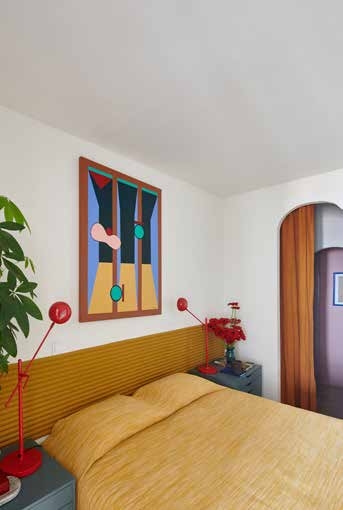 Le lit est encadré par deux rangements de bureau verts utilisés comme tables de chevet. Dessus, des lampes rouges vintage. La tête de lit a été réalisée sur mesure (Orac). Au mur, une toile de Sergio Prieto de la collection Introspective 2020.