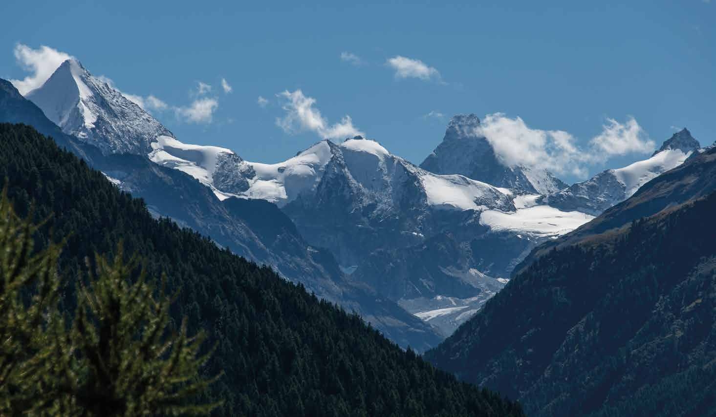 Le Grand hôtel Bella-Tola et sa vue sur le Cervin et les sommets enneigés des 4000, aussi appelés la "Couronne Impériale"