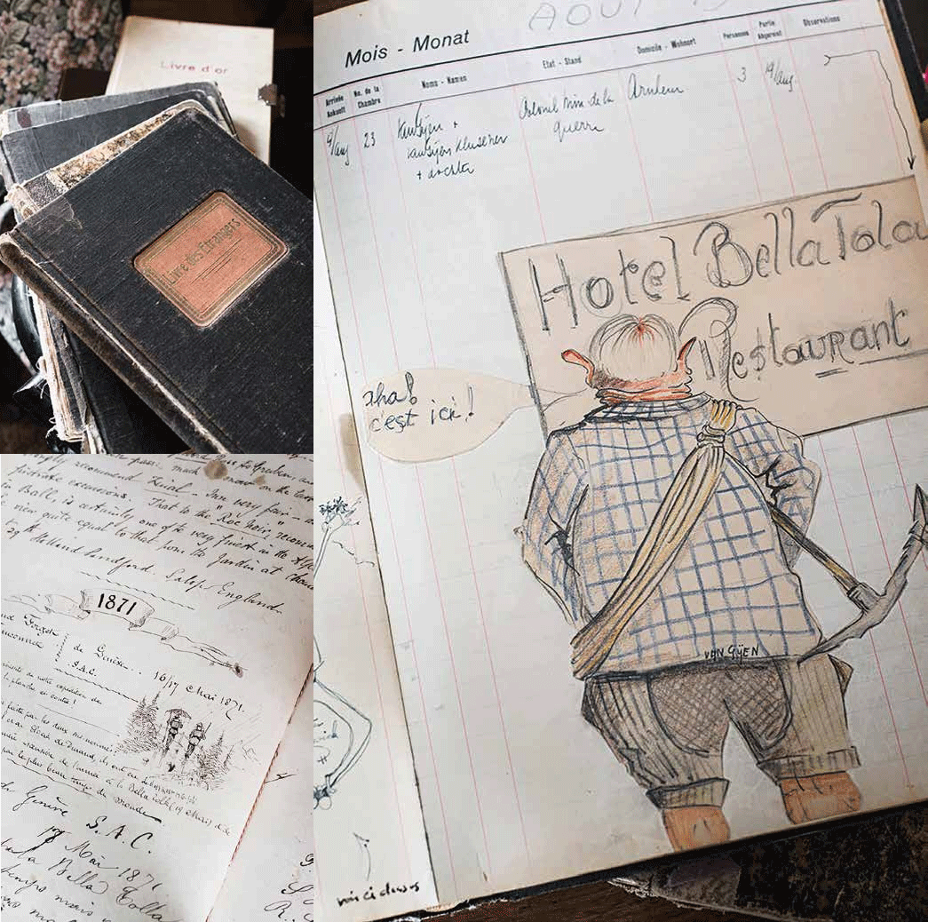 Le livre d’or raconte l’histoire de votre maison et en partage les souvenirs avec vos hôtes. En 1860, le Bella Tola ouvrait son premier Livre d’Or. Il s’appelait le Livre des Voyageurs. Il est vrai que c’était une expédition pour atteindre l’hôtel ! À pied, depuis Sierre. Les bagages suivaient à dos de mulet. Au fil des saisons, les pages s’égayent d’anecdotes, de dessins humoristiques. On y écrit en vers, en rimes et en chansons. On croque les départs à dos de mulet, fusil en bandoulière. On moque le Bavarois harnaché en parfait alpiniste… © David André