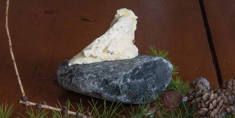 La cuisine de montagne, ce devrait être toujours très simple et très savoureux. Ce qui n’exclut pas d’être original, voire surprenant… comme par exemple ce beurre fumé, juché sur son rocher tel un Cervin miniature. Dans un petit fumoir, déposez des écailles détachées d’une écorce de mélèze, allumez, plongez le tuyau de fumée dans une coupe où vous avez déposé le beurre. Fermez hermétiquement. Le beurre va s’imprégner de la fumée de mélèze. Ajoutez du sel et fouettez la motte de beurre. Prenez un joli caillou de rivière et déposez d’un coup de spatule une petite montagne de beurre fumé. © Bella-Tola