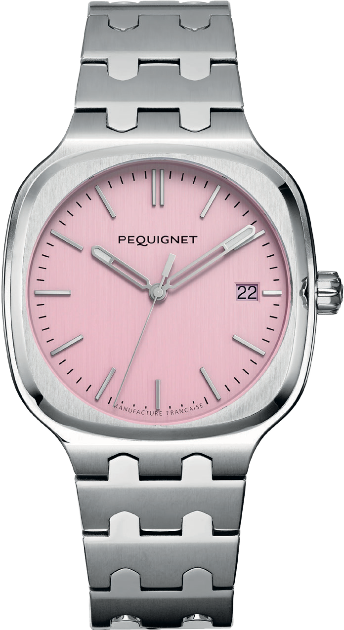 La manufacture française Pequignet revisite sa collection Concorde avec une douceur résolument féminine. Ce modèle, habillé d’un rose délicat, reprend les codes maison : acier poli, maille signature et calibre conçu et assemblé à Morteau. Une véritable ode au savoir-faire local, avec des composants sourcés à moins de 80 km de l’atelier.