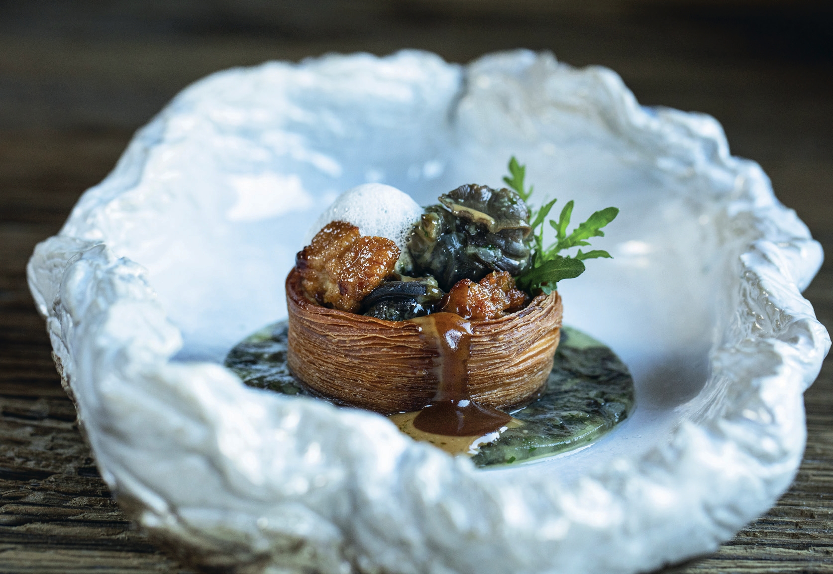 Escargots charnus d’automne au court-bouillon, feuilletage, éclats de ris de veau grillé.