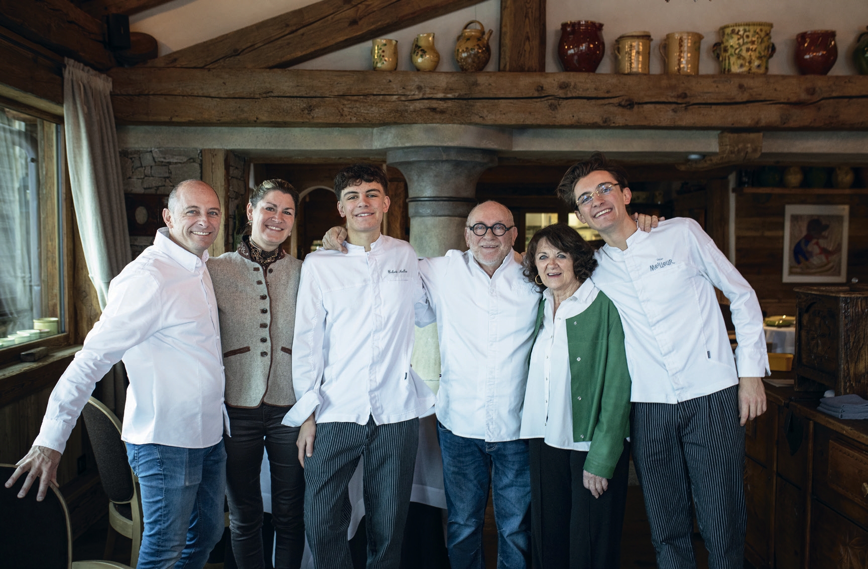 De retour dans l’écrin du restaurant, on se plonge avec délice dans l’histoire de la Maison, un véritable musée vivant. Cloches de vache suspendues aux poutres, poteries savoyardes dans le vaisselier, objets agricoles patinés par le temps… le patrimoine exposé témoigne du passé. Gardien de la mémoire de la vallée des Belleville et des Trois Vallées, René Meilleur continue de chiner, refusant de voir disparaître ce précieux héritage savoyard. En jetant un œil à la cuisine, on aperçoit René Meilleur, une force de travail qui forme un binôme redoutable avec son fils Maxime, ancien biathlète et compétiteur dans l’âme. Désormais en cuisine, ils peuvent compter sur les deux enfants de Maxime : Oscar, 23 ans et Calixte, 17 ans. « C’est extraordinaire de travailler ensemble. Oscar apporte une vision différente. Les idées fusent », se réjouit René, heureux de cette osmose en cuisine. « Il y a un vent de bonheur qui souffle sur La Bouitte ! Mes fils rentrent. Oscar joue un rôle primordial. Il s’affirme. Il n’a qu’une envie : décrocher la 3e étoile. Il n’est pas question qu’on en reste là », poursuit Maxime.
