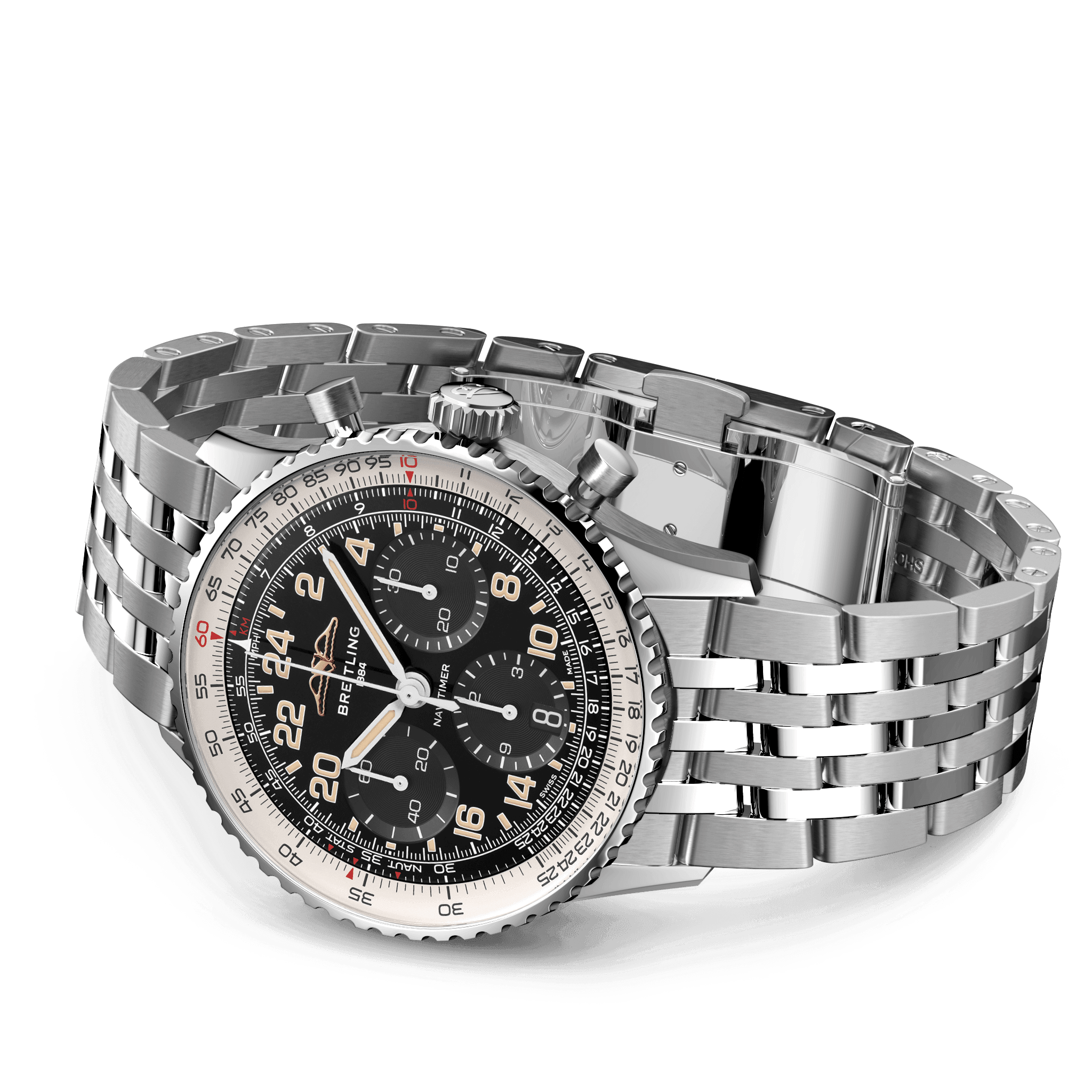 En 1884, Léon Breitling n’a qu’un objectif : concevoir des chronographes. Il faut attendre 1915 pour voir naître le premier chronographe bracelet, avec l’ajout du tout premier poussoir indépendant. En 1934, une nouvelle évolution majeure voit le jour : un second bouton poussoir vient séparer les fonctions Marche/Arrêt de celle de remise à zéro. Le chronographe moderne est né. La Navitimer est ensuite dévoilée pour offrir aux pilotes un instrument de précision, grâce à sa règle circulaire permettant de calculer le taux de consommation, la vitesse de montée ou encore les conversions kilomètres/miles/milles nautiques. En 1969, le premier chronographe automatique Breitling est conçu pour équiper la NASA et la Royal Air Force. La Navitimer devient alors la référence dans le monde de l’aviation, et l’astronaute Scott Carpenter la portera lors de son vol avec la capsule Aurora 7. Plus tard, c’est l’acteur et passionné d’aviation John Travolta qui deviendra le principal ambassadeur de la marque.