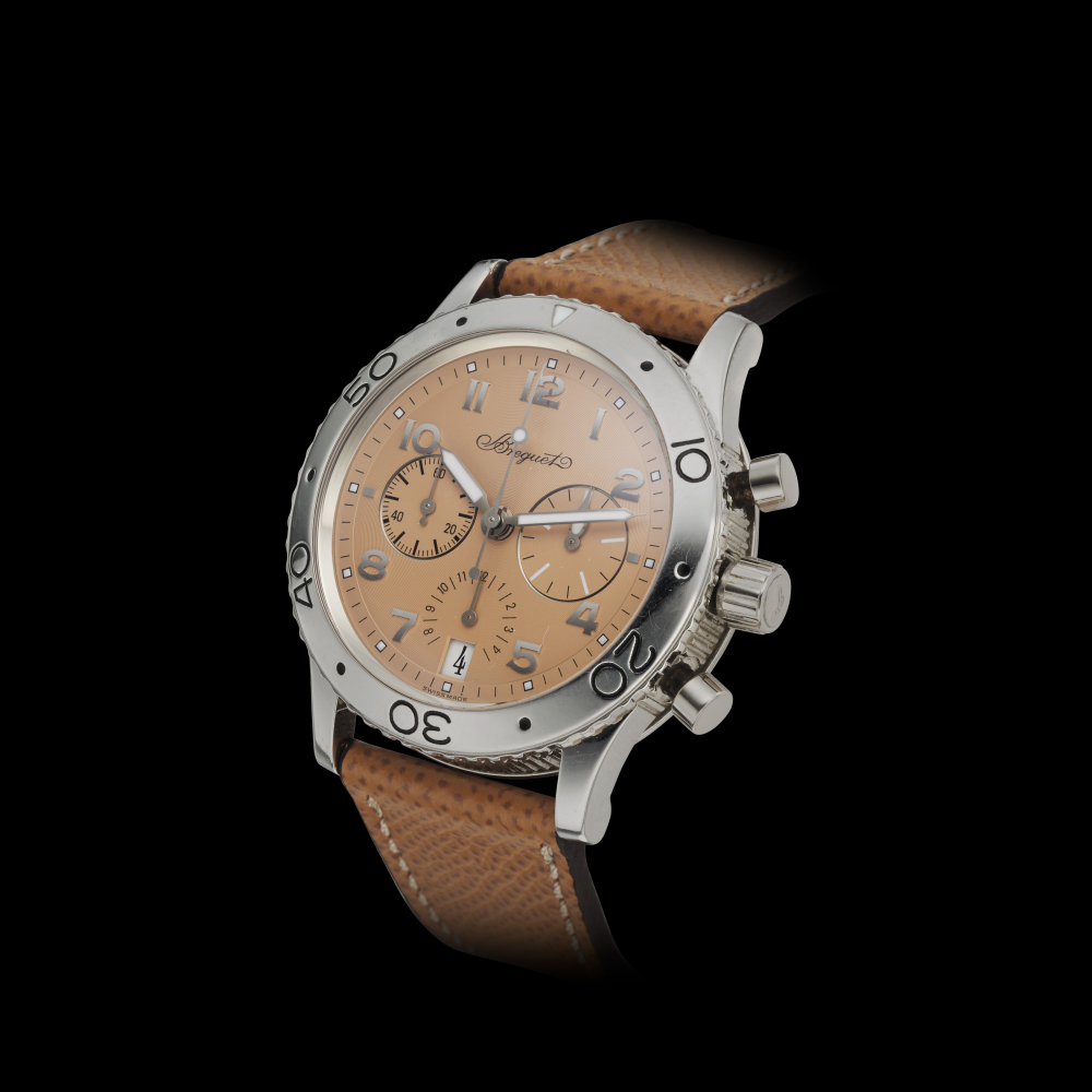 Référence absolue en matière de haute horlogerie, son fondateur Abraham Louis Breguet entame sa carrière en réalisant des coups de maître, dont la mise au point de la montre automatique dite « perpétuelle », l’invention du ressort timbre pour les montres à répétition et celle du premier dispositif anti-choc, le pare-chute. Apprécié du roi Louis XVI et de la reine Marie-Antoinette, Breguet créa pour la reine de Naples, Caroline Murat, la première montre bracelet. Plus près de nous, la marque s’associe avec l’armée française, qui impose à Breguet de tenir un cahier des charges engageant : un cadran noir à chiffres luminescents ; un minimum de deux compteurs pour le chronographe ; un diamètre supérieur ou égal à 38 mm ; un mouvement mécanique avec retour en vol (Flyback) qui permet aux pilotes de redémarrer le chrono en marche en une seule pression sur celui-ci. La TYPE XX tient toutes ces exigences pour devenir une magnifique pièce qui affole encore aujourd’hui tous les collectionneurs.
