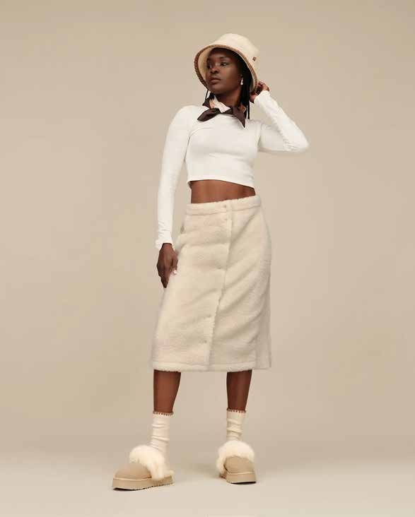À l’origine, UGG n’est pas une marque, mais un terme australien désignant ces bottes fourrées en peau de mouton, longtemps associées à une culture utilitaire et balnéaire. La société UGG telle qu’on la connaît aujourd’hui a été fondée en 1978 par un surfeur australien, Brian Smith, en Californie. L’idée était d’apporter le confort des bottes fourrées australiennes aux surfeurs pour se réchauffer après une session endiablée, tout en conservant une simplicité fonctionnelle. Depuis, la marque a radicalement évolué, passant d’un accessoire de niche à une icône lifestyle mondiale. Le chausson Disquette Chalet incarne parfaitement cette évolution. C’est la version hiver et robuste du modèle Disquette, qui conserve la silhouette ronde et plate emblématique, mais l’adapte pour l’extérieur avec une semelle épaisse crantée, pensée pour affronter le froid et l’asphalte, et poser quelques pas de « shuffle » aussi bien à la terrasse de la Folie Douce qu’à L.A. Son succès repose sur sa doublure en fourrure de mouton UGGPure et son extérieur en suédé, combinés à un design surdimensionné « chunky » assumé, qui s’inscrit pleinement dans la tendance « gorpcore », ou comment détourner les codes de la randonnée et de l’outdoor pour les imposer comme de véritables pièces de mode urbaine.