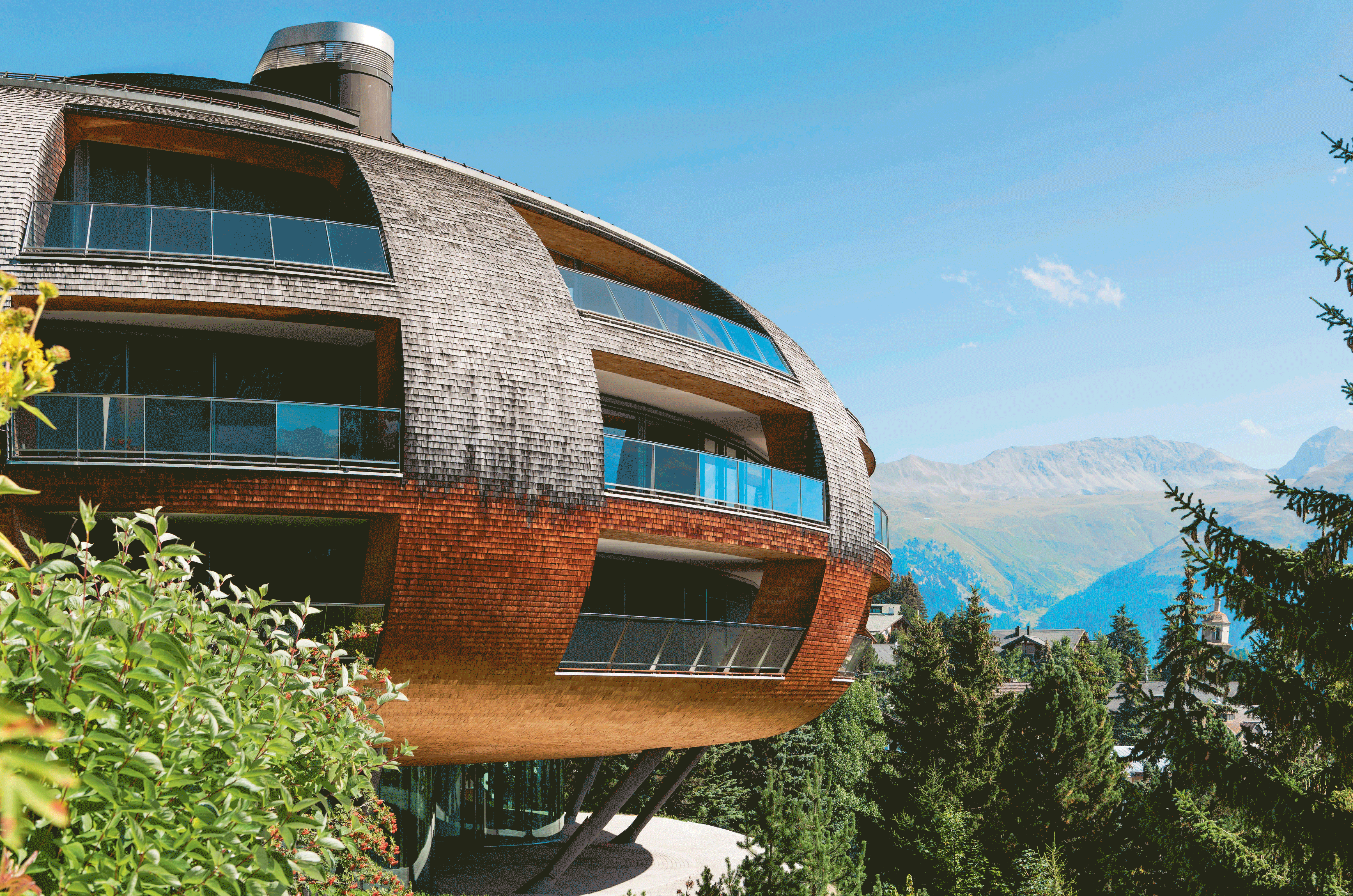 Chesa Futura : une bulle futuriste en bois, fusionnant innovation et tradition alpine dans le paysage de Saint-Moritz, où l’architecture organique défie le temps et le paysage d’Engadine.